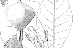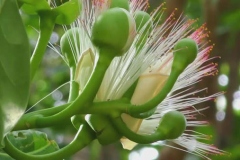 Flowers very showy with four white petals and lots of fine, pink-tipped stamens forming a pom-pom shape (10-15cm). According to Corners “the buds beginning to swell at noon, but the petals and stamens do not unfold until nearly sunset when the heavy perfume becomes noticeable”. By sunrise the next day, the entire circle of stamens and petals fall off the tree.