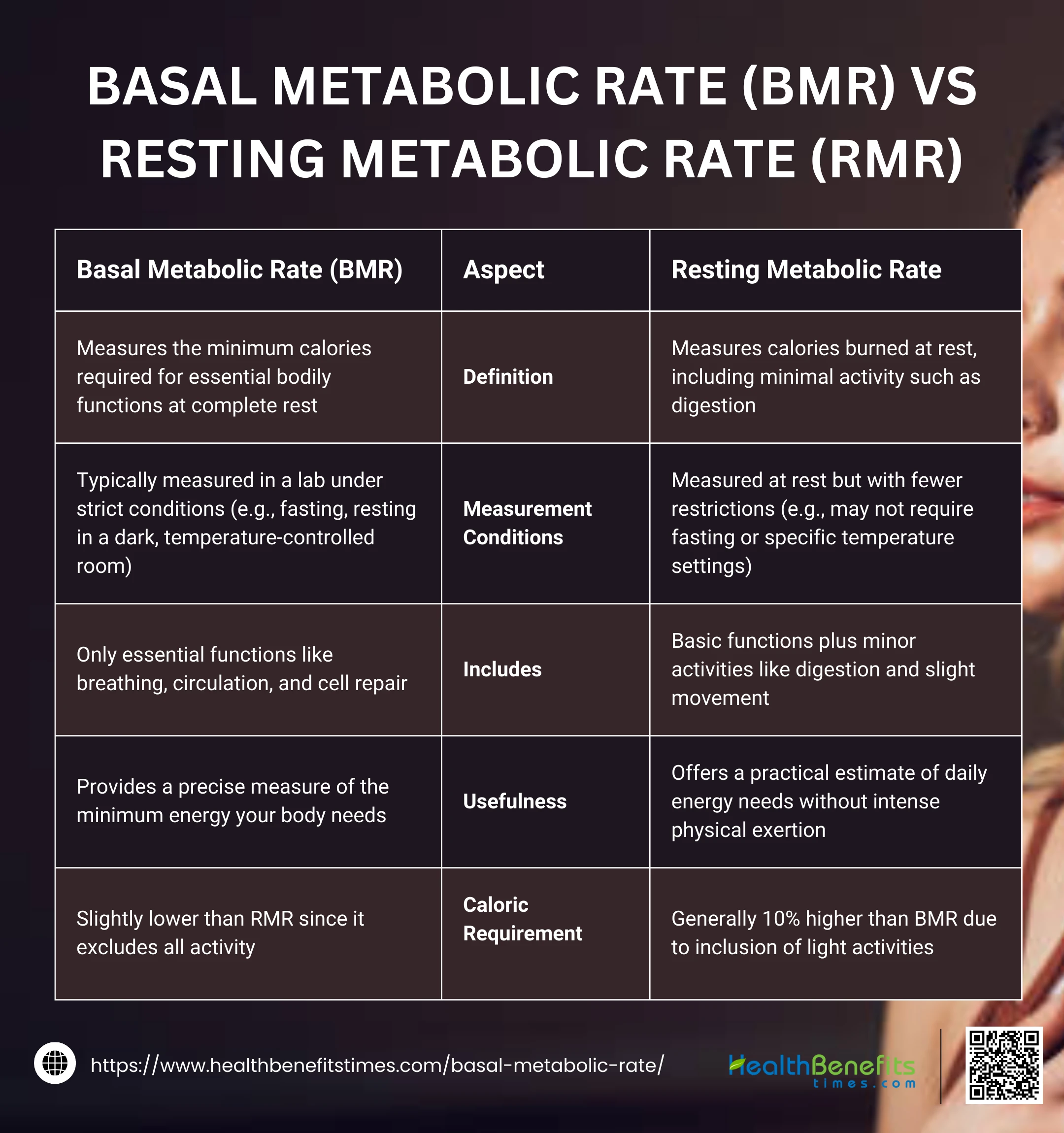 | Caloric Requirement | Slightly lower than RMR since it excludes all activity | Generally 10% higher than BMR due to inclusion of light activities |