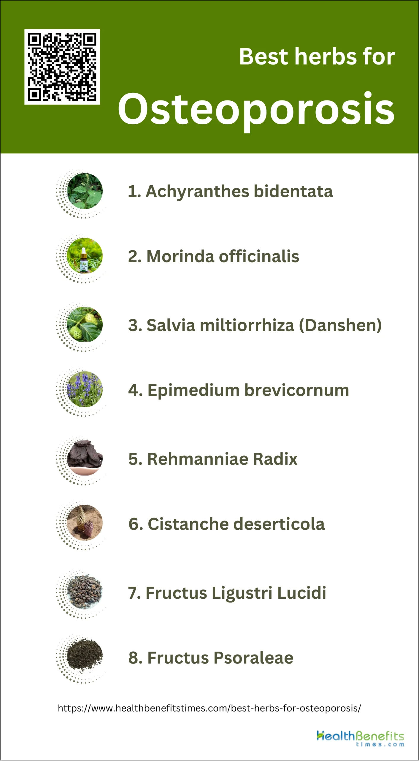 Using herbs to care for osteoporosis instead of conventional medication offers several advantages, primarily due to the reduced risk of adverse effects and the holistic benefits associated with herbal treatments. Conventional medications, while effective, often come with significant side effects such as gastrointestinal issues, atypical fractures, and cardiovascular risks. In contrast, medicinal herbs, particularly those used in Traditional Chinese Medicine (TCM), have been employed for centuries with a high safety profile and minimal side effects. Herbs like Herba Epimedii, Rhizoma Drynariae, and Salvia miltiorrhiza have shown promising results in enhancing bone mineral density and promoting bone health through various mechanisms, including estrogen-like effects, antioxidant properties, and anti-inflammatory actions. Additionally, herbal treatments are supportive and slow-acting, making them suitable for long-term prevention and maintenance of bone health, especially in postmenopausal women. Therefore, herbs present a viable alternative or complementary approach to conventional osteoporosis treatments, offering a safer and potentially more holistic method of managing this chronic condition.