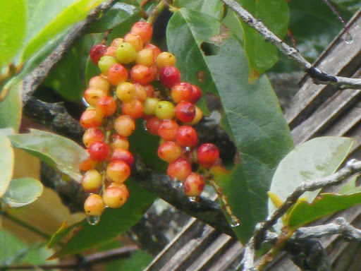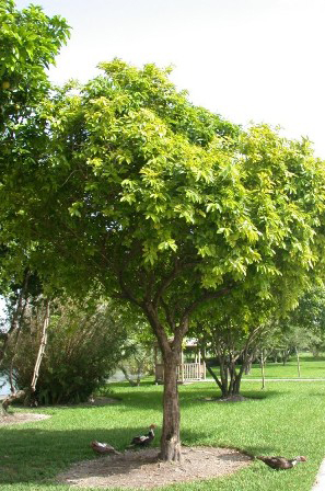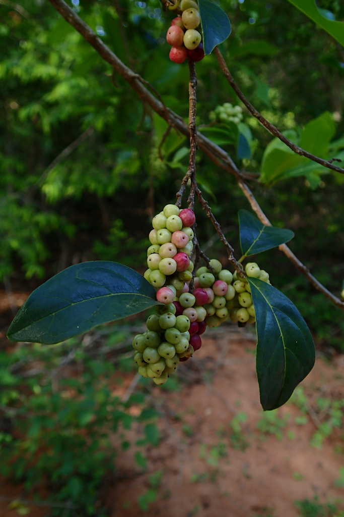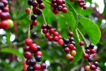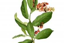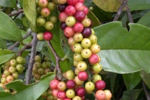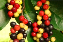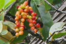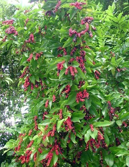 It is able to grow 15 to 30 meters high having trunk diameter of 20 to 85 cm. Leaves are leathery, evergreen, oval shaped and is about 20 cm long and 7 cm wide. This species is dioecious which means male and female flowers grow on separate trees. Flowers possess strong and unpleasant scent. Pistillate flowers grow on long racemes and staminate flowers are found in small bunches. Fruit are globose or ovoid which is 5 to 11 mm by 4 to 7 mm in size hanging singly or paired in long and heavy bunches. Fruits are green at first which turns to yellow to pink to red and bluish to violet when fully matured. The fruit skin has red juice and the white pulp has colorless juice. Each fruit contains straw colored seed which is oval, compressed measuring 6 to 8 mm by 4.5 to 5.5 mm. When the fruit is immature, it has sour taste and becomes sweet when ripe.