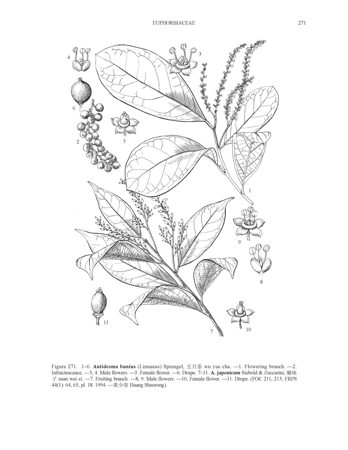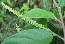 Bignay is a dioecious, evergreen and perennial tree growing upto 15 to 30 meters in height with trunk diameter of 20 to 85 cm. The tree has yellow brown bark, terete branchlets which are glabrous to densely ferrugineous to pubescent. Leaves are leathery, oval shaped, evergreen which measures 20 cm long and 7 cm wide. Leaves are distichous having petiole furrowed. It is short and glabrous to ferrugineous to pubescent. It possesses pubescent, linearlanceolate and caduceus stipules. Lamina of leaf is oblong to elliptic, apex acuminate, base obtuse or rounded to shallowly cordate, glabrous and glossy green above. An inflorescence is staminate, axillary measuring 6 to 15 cm long and consists of 3 to 8 branches having deltoid to elliptic and pubescent bracts. Staminate flowers are sessile measuring 3 to 4 mm by 3 mm. Pistillate inflorescence are axillary, simple or four branched and measures 4 to 17 cm long. Pistillate flowers measures 2.5 to 3 by 1.5 mm. Pedicles are pubescent to glabrous and is about 0.5 to 2 mm long. Calyx is cupular and measures 1-1.5 by 1.5 mm. An ovary is glabrous to very sparsely pilose and ellipsoid. Fruits are glabrous, ovoid or globose in shape and are about 5 to 11 mm by 4 to 7 mm. Fruit is green which later on turns into yellow, pink, red or bluish to violet when fully ripened. It consists of hard kernel in straw colored, compressed, oval, ridged or fluted and is about 6 to 8 mm by 4.5 to 5.5 mm.