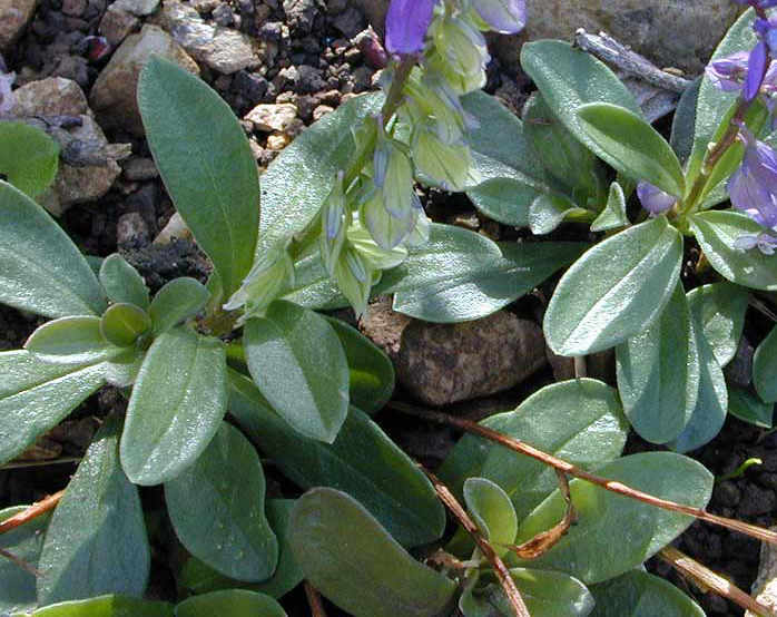 Bitter Milkwort is a perennial, flowering plant that grows about 5 to 15 cm high. The plant is found growing in grassland and Damp Mountain pastures, especially on chalk and limestone. The plant prefers moderately fertile moisture-retentive well-drained soil. The stems are branched at the base, decumbent or ascending. The basal leaves form a rosette, while the cauline leaves are alternate, oblong-cuneate or obovate-lanceolate. The leaf blades are smooth edged and undivided.