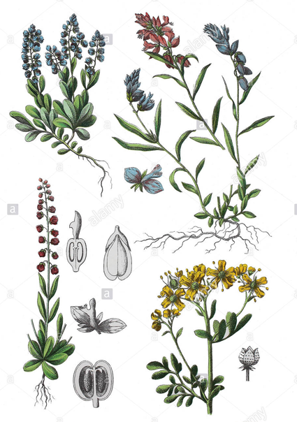 The blue or occasionally white or pink flowers are in many-blossomed racemes. Of the 5 sepals, the 2 lateral ones are large, petal-like, patent and 3-veined. The other 3 are smaller; die middle vein is green. The 3 petals are fused together with die stamens. These form 2 clusters in 2 green pockets on the larger, lower petal. The 2 upper petals form a kind of upper lip. The ovary is superior and bilocular witfi a spoon-like style. The fruit is an obcordate capsule, compressed at die sides and enclosed in the sepals. The fruit consists of two black seeds.