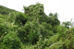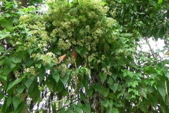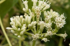 | Flower | Numerous fluffy flower-heads (i.e. capitula) are borne in branched clusters originating in the forks of the leaves or forming at the tips of the branches (i.e. in axillary or terminal corymbs). These flower-heads (i.e. capitula) are small (3-6 mm long) and white or greenish-white in color. They do not have any obvious petals (i.e. they have no ray florets) and consist of four tiny flowers |