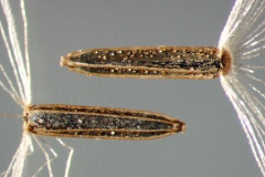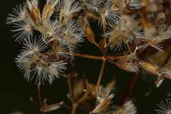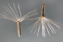 The tiny black or blackish-brown ‘seeds’ (i.e. achenes) are elongated (i.e. linear-oblong) in shape and five-angled in cross-section and truncated at the top. These seeds are 1.2-2 mm long and 0.2-0.6 mm wide and are topped with a ring (i.e. pappus) of numerous (30-38) whitish coloured hairs or bristles that are 2-4 mm long, which can carry the seed large distances on air currents and attach itself to the hair of animals. A single stalk can produce between 20 and 40 thousand seeds a season.