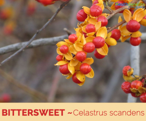 Bittersweet scientifically known as Celastrus scandens, is a species of Celastrus that blooms mostly in June and is commonly found on rich, well-drained soils of woodlands. Bittersweet is commonly known as American bittersweet, bittersweet, bitter nightshade, woody nightshade, climbing bittersweet, false bittersweet, climbing orange-root, fever-twig, fever-twitch, staff-vine, jacob’s-ladder and waxwork. The plant is native to central and eastern North America including Missouri. In Missouri, bittersweet is typically found in woodland areas, thickets, rocky slopes, bluffs, glade peripheries and along fence rows throughout the State (Steyermark). In the 1700s, plants were given the name bittersweet by European colonists because their fruits supposedly look like in appearance the fruits of a Eurasian nightshade (Solanum dulcamara) that was known to them as bittersweet. The common name of false bittersweet also came to be used for the within species to distinguish it from the Eurasian nightshade. American bittersweet is the generally accepted common name that is used today.