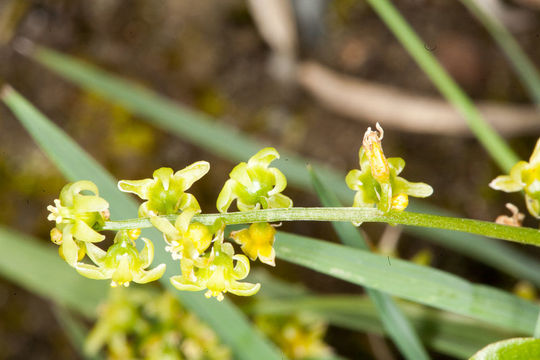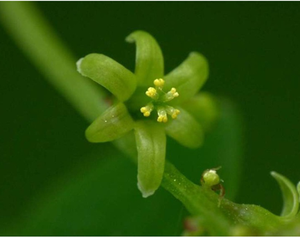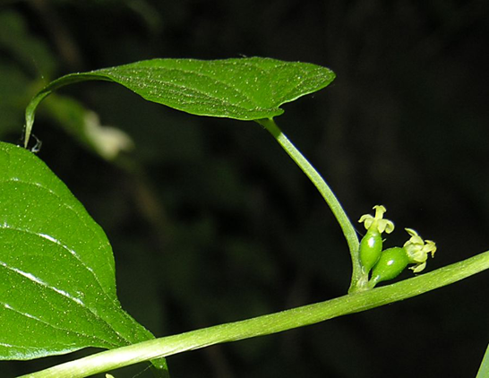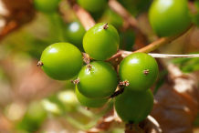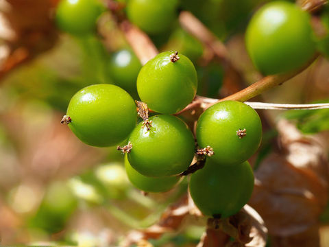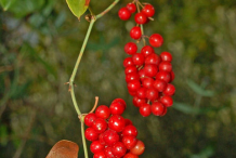 The flowers have a bell-shaped perianth, and are small, yellowish-green, and regular, in axillary racemes on long stalks. The plant is dioecious. The male flowers are solitary or grouped in slender racemes, branched at the base, with 6 stamens inserted on the base of the perianth-segments. The female flowers are in shorter racemes, bent back, few-flowered, with a perianth adhering to the ovary, and short functionless stamens. The bracts are very small. The limb of the perianth is 5-partite. There is a single style. Flowers are found on various plants in fertile and infertile form. The fertile flowers develop into crimson berries. Berries are initially green and are scarlet red when ripe. The berry is oblong, few-seeded, and imperfectly 3-celled. Each berry contains (3) 6 globose seeds of red-brick or brownish color.
