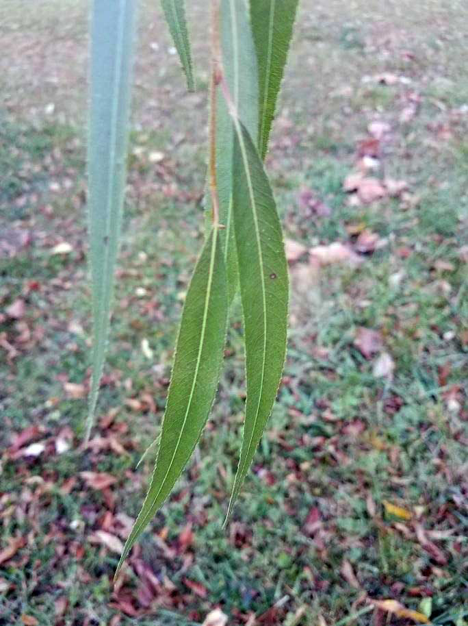Leaves are simple, alternate and deciduous. Each leaf is lanceolate and linear. They are rounded or wedged at bases and long tapered tips which are curved to one side and finely serrated margins with 15 to 30 teeth per inch. They are 1 to 8 inches long and about 1/8 to ¾ inches wide. They are hairless, shiny dark green above and lighter green below. Leaf petioles are short, glandless, hairy and short. Leaves are fast growing shoots having stipules which often encircle the shoot. Stipules are large, green, paired, ovoid or semi-cordated, persistent and dentate.