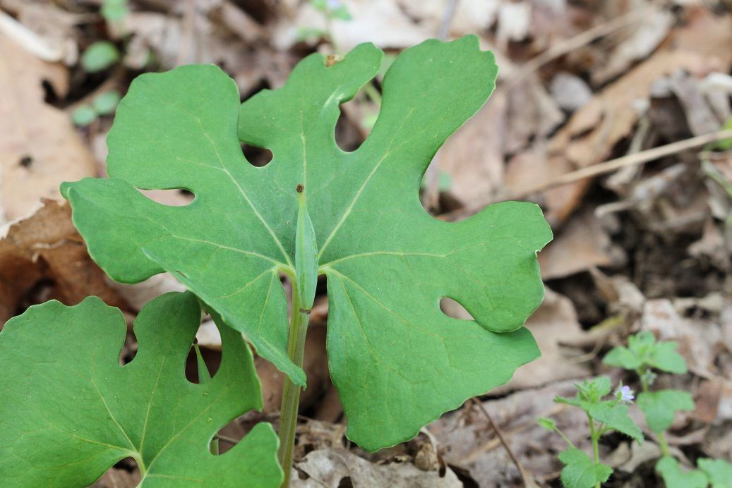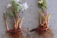 Bloodroot is a herbaceous perennial plant growing to 20-50 cm (7.9-19.7 inch) in height. The leaves are basal, kidney shaped with 2.5-8 inches (6-20 cm) wide. The flowers are two inches across with eight to twelve white petals and are hermaphroditic. Flowering occurs between Late March to Early April. The pod is an oblong, elongate capsule which is 1-2 inches (3-5 cm) long which has round, black to orange red seeds of 1/16th-1/8th inches (2-3 mm) long. Stems are smooth, round, pale green which is tinged with red and 8 inches in height. The roots are thick, round and 1-4 inch (2.5-10 cm) long which has bright orange sap.
