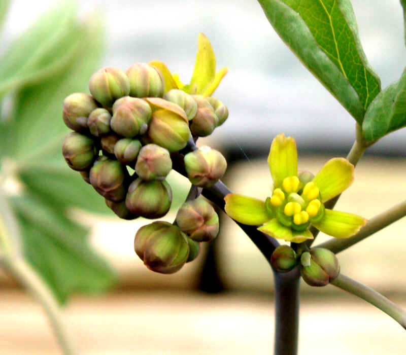 The non-flowering plant bears single compound leaf whereas the flowering plant bears a couple compound leaves at the apex of stem. A flowering plant has lower compound leaf that is found at the middle of the central stem that could be divided into 3 compound leaflets. Every leaflet is composed of 9 subleaflets. The leaflets are ascending, glabrous, long and light green in color. The subleaflets measuges about ¾-2″ across (wide) and 1-3″ long and is broadly ovate-oblong to obovate-oblong with blunt tips.