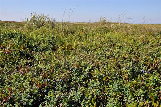 Bog Bilberry is a low, highly branched, deciduous shrub that grows about 10–75 centimeters (0.33–2.46 ft.) tall, rarely 1 meter (3.3 ft.) tall with round, gray-brown, glabrous branches and a creeping rhizome. The plant is found growing in coastal and interior bogs, cotton grass tussock tundra, low shrub tundra, sedge meadows, black or white spruce woodlands, forested areas, rocky or sandy shores of lakes and streams, rock outcrops and barrens. The plant prefers organic or inorganic soils that are generally acidic and is found growing abundantly on well-drained to poorly drained sites. The plant has many green, triangular, erect stems and twigs are slender. Older twigs have gray, shreddy bark.