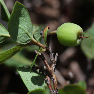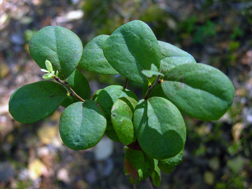 Leaves are alternate, deciduous, from broadly egg-shaped to oval or elliptic, 0.4-3 cm long, 0.2-1.5 cm wide, rounded at tips, tapered at base, glabrous or minutely hairy, with slight bloom, strongly net-veined, margins entire, rolled under somewhat. The undersurface has a protruding, reticulate vein system and is blue-green. The upper surface of the leaves is light matte-green to almost white.