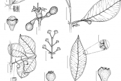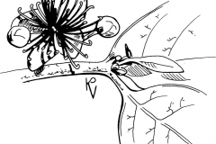 Flowers are white, regular, and bisexual, borne singly or in clusters of three in the axils of leaf on 1–2.5 cm long terete pedicels. Calyx is splitting into irregular, pubescent, pale green lobes, corolla with five white spreading concave obovate lobes, stamens numerous 150- with bilocular anthers, ovary ellipsoid to globose, three to five locular with numerous ovules and style subulate.