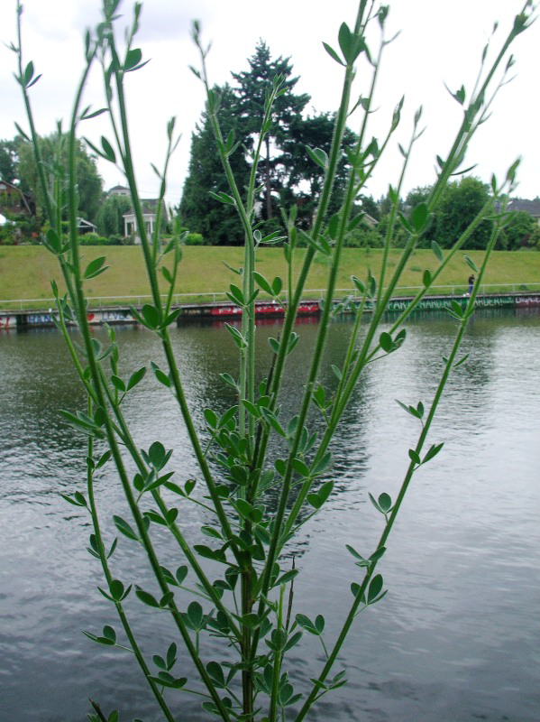 Broom is a multi-stemmed, deciduous/evergreen, erect and bushy shrub that grows about 6 to 12 feet (2-4 m) tall. They are found growing in disturbed areas, open forests, roadsides, grasslands, pastures, cultivated fields, wasteland, dry meadows, dry riverbeds and other waterways, sandy pastures and often near the coast. It prefers moderately fertile, dry to medium, well-drained soils. It can also tolerates poor rocky soils (good bank cover), but avoid wet soils. It has taproot that may exceed 2 feet in length with large, shallow lateral roots. Stem is hairy when young and glabrous as they mature. Branches are numerous long, straight, slender bright green branches, tough and very flexible, smooth and prominently angled.