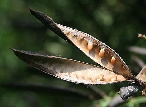 Oblong pods are 2.5-7 cm long and 8-13 mm wide, dehiscent, strongly compressed,