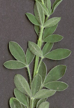Leaves of broom are alternate and compound consisting of three oblong leaflets. Very few leaves are present on stems. New twigs may only have one leaflet. Leaflets are small approximately 0.3 to 0.7 inch (5-20 mm) long and 1.5 to 8 mm wide. The leaflets are dark green and fleshy and serrated along their margin. The underside of the leaflets is covered by flattened, short hairs while the upper surface is smooth.