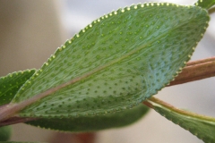 Leaves are alternate to opposite, 14-25 mm long and 6- 14 mm wide, broadly elliptic to nearly round (average length: breadth ratio 1.95), with rounded and recurved apex; glabrous with prominent main and subsidiary veins on abaxial surface; gland dotted on underside; margin serrate with an oil gland at the base of each serration. Leaves have a strongly aromatic taste and a peppermint-like odor. The leaves are harvested when the plant is flowering or fruiting in summer. They are covered in oil glands that give them an oily, wet appearance.