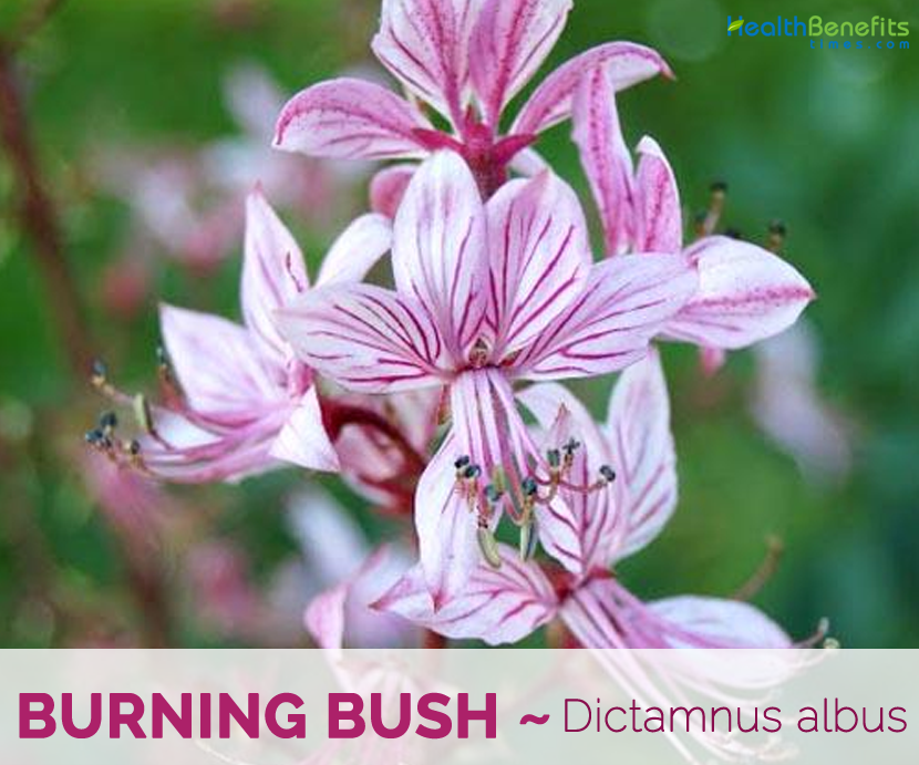 Dictamnus is a genus of flowering plant in the family Rutaceae, with a single species, Dictamnus albus, which has several geographical variants. It is known variously as Burning bush, Pink Burning Bush, false dittany, white dittany, gas plant and Fraxinella. It is an herbaceous perennial, native to warm, open woodland habitats in southern Europe, North Africa and much of Asia and is grown as an ornamental in many places. Genus name comes from the Greek name for a Cretan origanum, probably named after Mount Dikte. Foliage consists of oil that causes allergic reactions (skin rash) in some individuals. In hot weather, old flowers or seed pods discharge a flammable oil which, on a windless summer evening, can be burned with a match resulting in a brief vapor burn which is harmless to the plant, hence the common name.