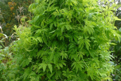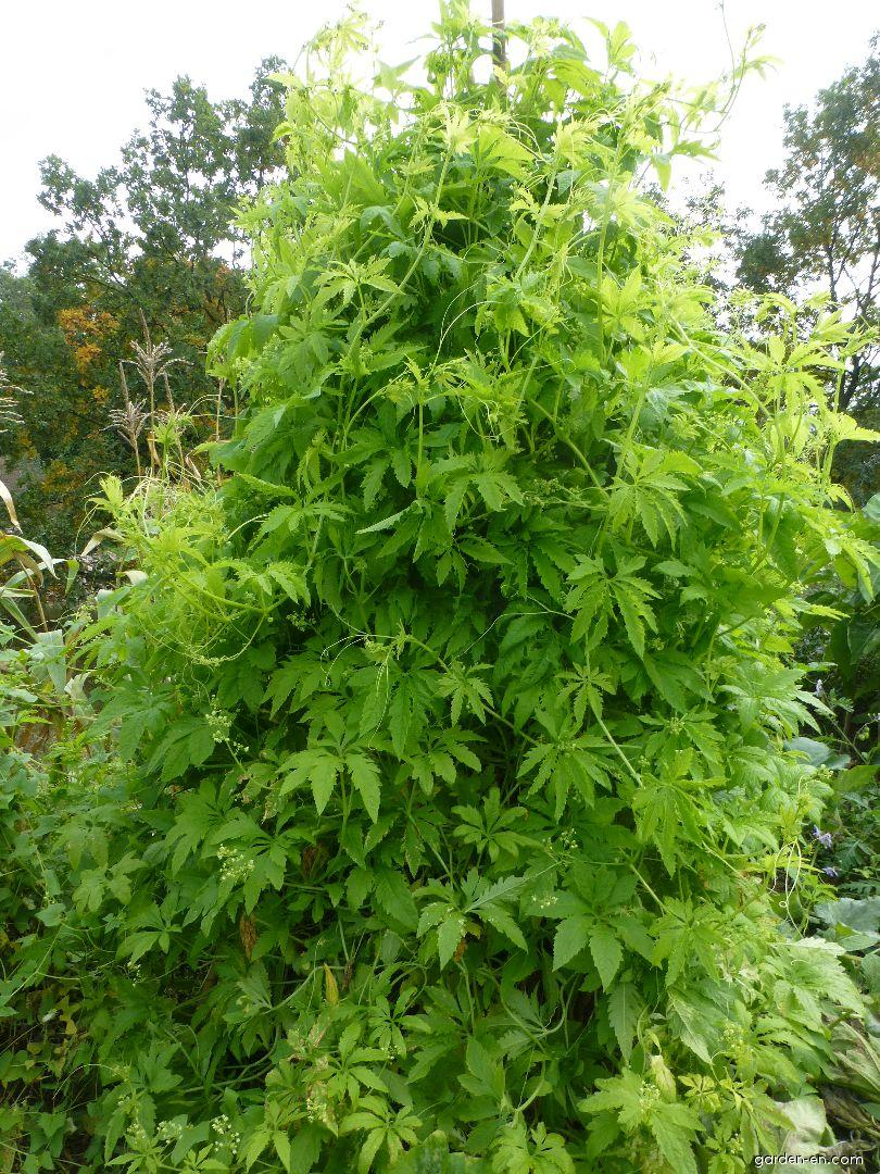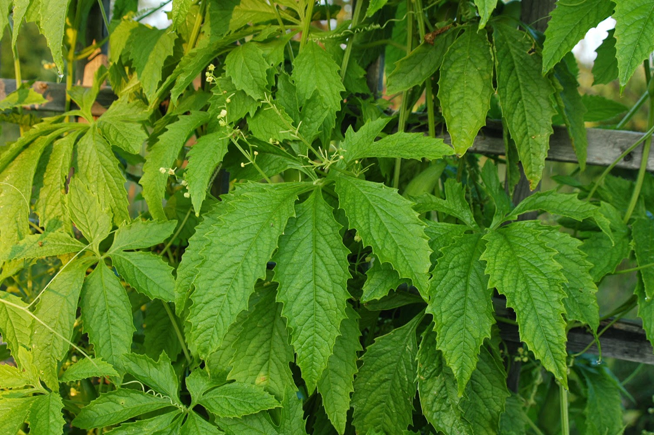 Leaf Leaves are composed of three to five, toothed, light green, lance-shaped leaflets fused at the base, in a cart-wheel shape up to 20 cm (8 in) in diameter. They are attached to the vine on 8 to 10 cm (3 to 4 in) long leaf stalks