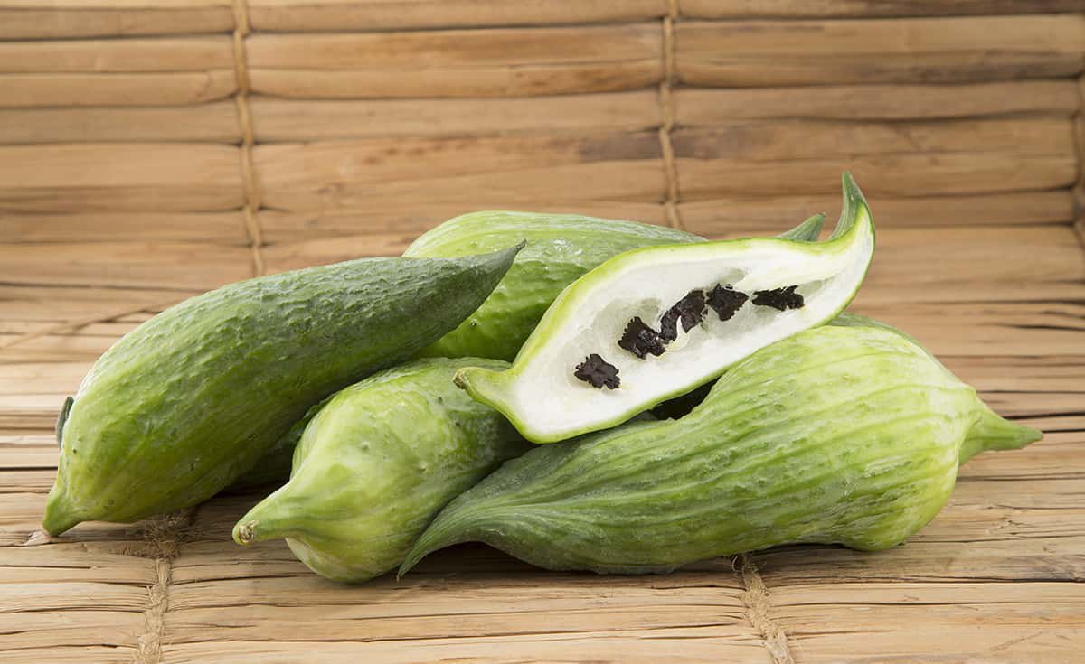 Female flowers that are fertilized develop into tear shaped fruit that is 10-20 cm long and 3–8 cm wide, irregularly ovoid, curved and pointed at the ends. Fruits are dark green with smooth, ridged skin when young, ripening to a light yellow-green hue with smooth or spiked skin, depending on the variety. The fruit surface can be smooth or softly spiny with a shaggy appearance. Underneath the surface, the flesh is pale green to white with a spongy and crisp consistency, only 0.5 cm thick, and is said to have a flavor resembling that of cucumbers. Over time, the flesh will begin to hollow, developing a cotton-like texture, encasing several black seeds in the center of the pod. It was observed that fruits growing on a plant sprawling on the ground were more irregularly shaped than usual: the stylar end of the fruit, normally pointed and black, was curved so as to occur on the upper side of the fruit, attributable to greater growth of the lower side of the fruit.