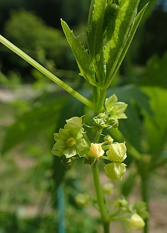 Flower Monoecious, but the staminate flowers are borne in racemes, whilst the pistillate flowers are solitary. As compared with other cucurbits, Caigua flowers are relatively inconspicuous; they are light green or white and small, only several millimeters in diameter. The male flowers occur in small clusters and the female flowers are solitary.