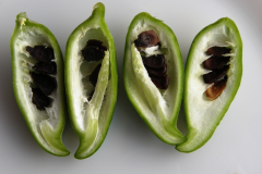 The seeds are edible and soft when young, transforming into hard, black, and inedible, arrow-shaped kernels as they mature. Seeds are 12 mm long, 7 mm wide and 3 mm thick and are flat and matt black. In shape, they are said to resemble diminutive mud turtles, having head and neck outstretched and four projections at angles where the feet would be. The surface is not smooth, instead described as pimply, with ridges and depressions. They are distributed in two rows in number of 12 normally attached to a placenta.