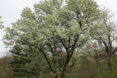 Callery pears are a medium-sized ornamental deciduous tree that normally grows about 60 ft. (18 m) in height and 2 ft. (0.6 m) in diameter. The crown shape is variable, depending on the cultivar, ranging from broadly ovate to pyramidal to columnar. The branches range from glabrous to sometimes densely pubescent. Terminal buds of the species are densely pubescent and much larger than those of other Pyrus species, often reaching 12-15 mm in length. The plant is found growing in slopes, plains, mixed valley forests, thickets, stream sides, woodland edges, bottomland forests, old field fencerows, roads, rights-of-ways, along the margins of understory along creek banks, degraded open woodlands, woodland borders and fallow fields.