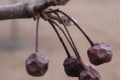 | Twigs | Twigs are thorn less in cultivated trees, but in wild types (including trees that develop from sprouts of a tree that was felled), the twigs end in thorns. Twigs are reddish-brown to grey with large, ovate, fuzzy terminal buds about 0.5 to 1.5 centimeters in length on branch tips and spur shoots. |