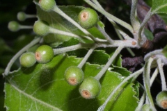 Fertile flowers are followed by persistent clusters of small pears (pomes), 0.3 to 0.5 inch (8 to 12 mm) long and wide. The fruits are initially green ripening to tan then maroon with numerous surface speckles, dangling on thin, 1-inch (2.5 cm) long stems. They are fleshy, tart but edible, containing 2 to 6 maroon seeds and numerous stone cells. Fruits are hard, almost woody, until softened by frost, after which they are readily taken by birds, which disperse the seeds in their droppings.