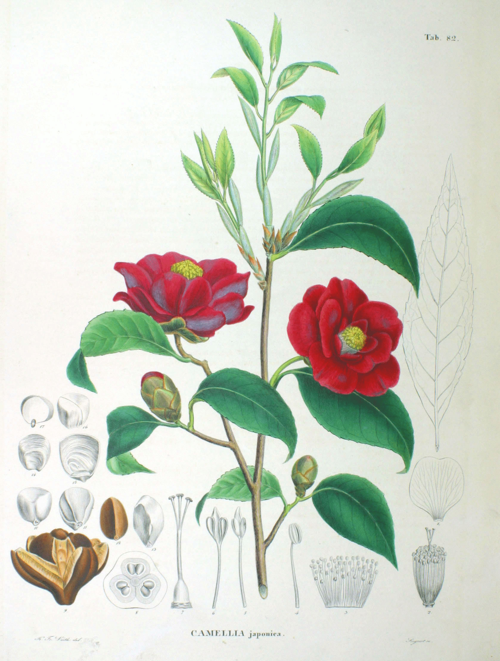 English: Camellia, Common camellia, Japanese camellia, Camellia Albino Botti, Camellia Don Pedro, Camellia Eugene De Massina, Camellia Princess Mary, Donckelaer’s Japanese Camellia,