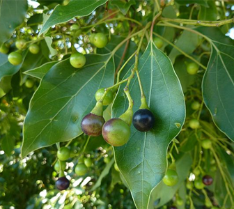 The tree has small, white flowers and sessile on 1-1.5 mm long pedicles. Flowers are caespitose on long axillary petioles. Stamens are 1.5 mm which forms three circles and are pubescent with broad and sessile cordate glands. Flowers turn into purple-black fruit which contains one seed. Fruit measures 1 cm in diameter.