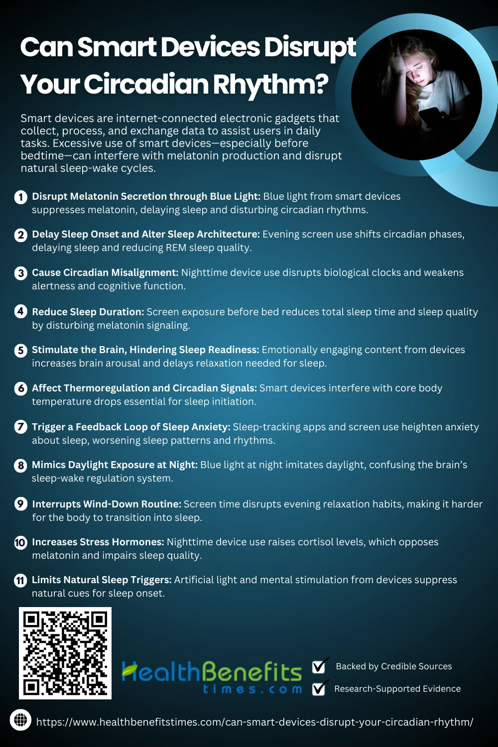 - Excessive use of smart devices—especially before bedtime—can interfere with melatonin production and disrupt natural sleep-wake cycles.