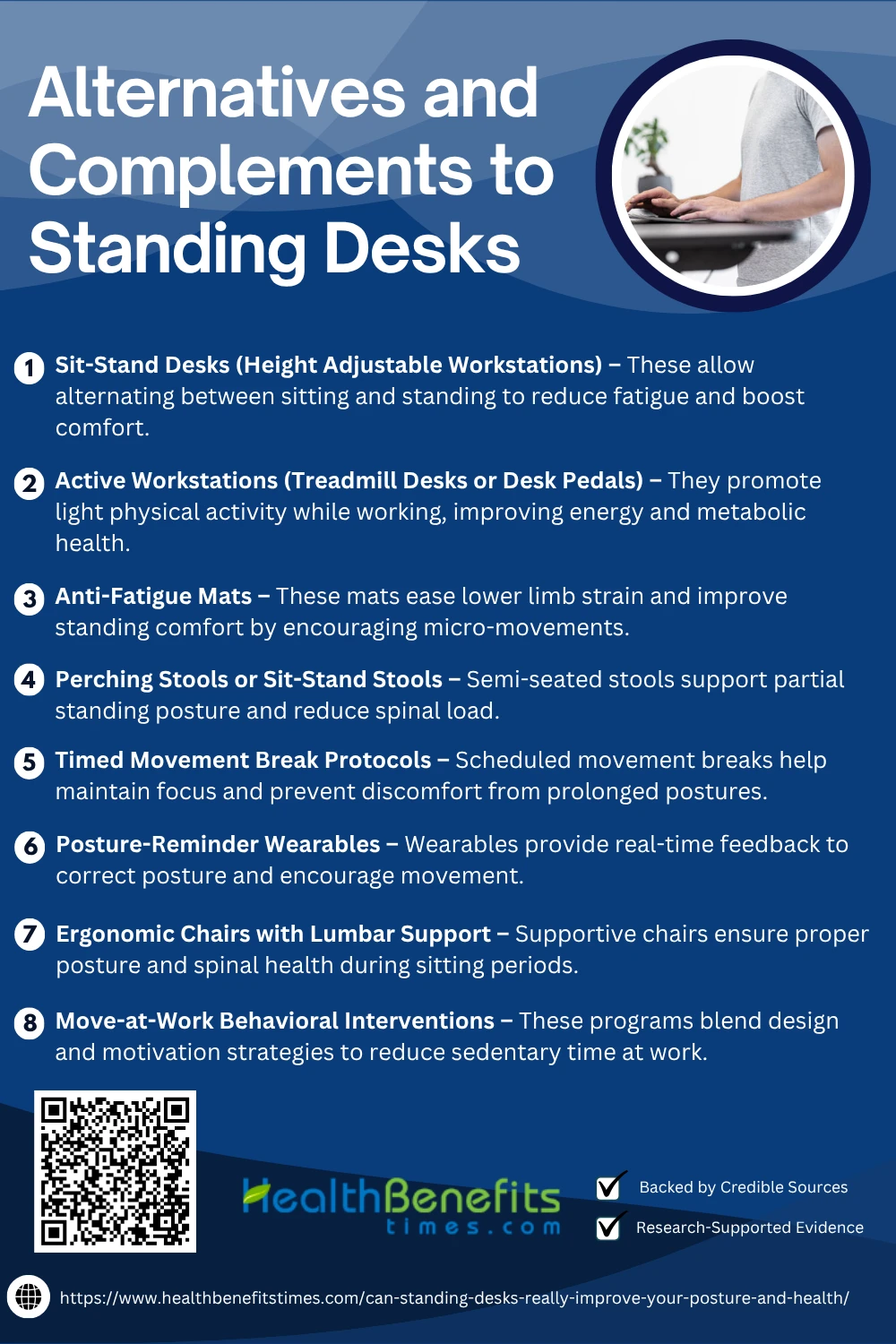 Alternatives and complements to standing desks include treadmill desks, balance boards, sit-stand converters, and active sitting chairs. Regular movement, stretching, and ergonomic tools further support posture and overall health.