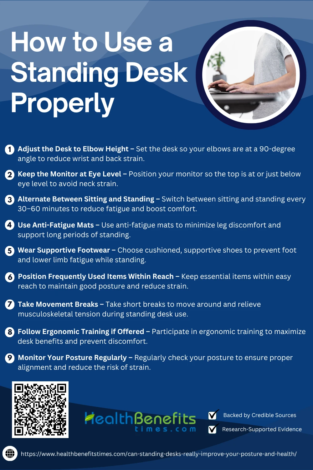 - Standing desks can improve posture and reduce health risks linked to prolonged sitting when used correctly and combined with regular movement.