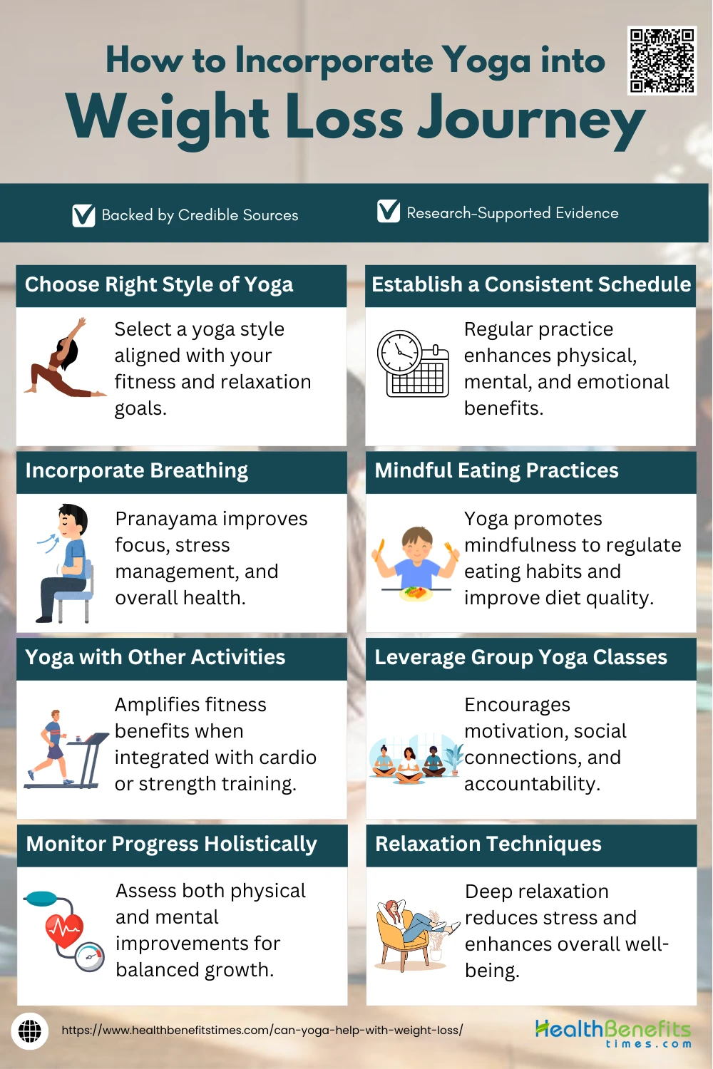 Incorporating yoga into a weight loss journey offers a balanced approach to achieving fitness goals by addressing both physical and mental well-being. Dynamic styles like Vinyasa or Power Yoga promote calorie burning and muscle toning, making them effective for weight management (67). Yoga also fosters mindfulness, which helps in controlling emotional eating and developing healthier dietary habits (68). Moreover, practices like pranayama and restorative yoga balance stress hormones, supporting metabolic health and overall weight management (69). Combining yoga with other fitness routines and maintaining a consistent schedule can further enhance its effectiveness in achieving sustainable weight loss (70).