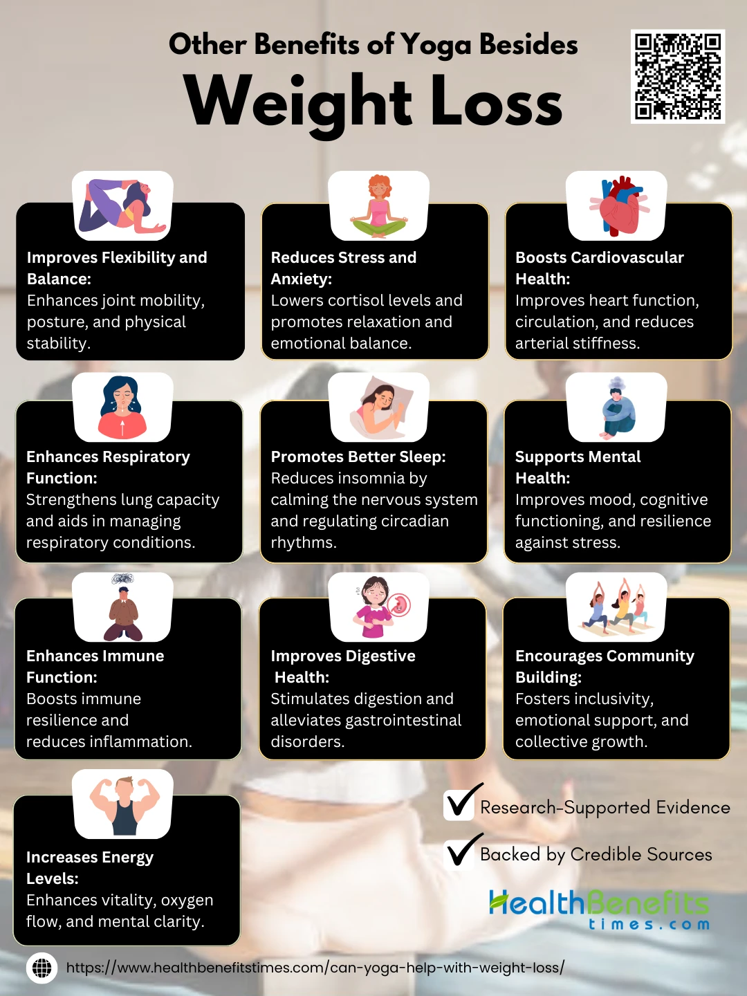 Yoga offers a myriad of benefits that extend well beyond weight management. Regular practice improves flexibility and balance, helping individuals maintain physical stability and prevent injuries (33). It also reduces stress by lowering cortisol levels and promoting relaxation, making it a powerful tool for mental health enhancement (34). Furthermore, yoga has been linked to better cardiovascular health, as it reduces blood pressure and improves lipid profiles (35). Additionally, it enhances respiratory function and lung capacity, particularly through pranayama and other breathing exercises (36). These benefits underline yoga’s role as a holistic approach to physical and emotional well-being.