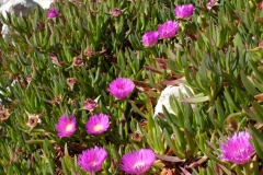 Carpobrotus dimidiatus has rose-purple flowers and grows on dunes in the Eastern Cape to KwaZulu-Natal and Mozambique.