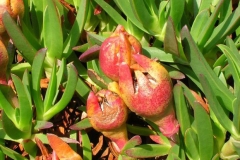 Carpobrotus edulis, Cape fig or Hottentot fig, is a ground-creeping plant is a member of the fig-marigold family Aizoaceae, one of about 30 species in the genus Carpobrotus. It was previously classified in Mesembryanthemum and is sometimes referred to by this name: Mesembryanthemum edule. It is a creeping, mat-forming herb native to South Africa, but has established in many cooler, very sandy soiled, Mediterranean regions of California and Australia. Few of the popular common names of the plant are Cape fig, Fig-marigold, Highway ice plant, Hottentot fig, Ice plant, Sour fig, Pigface, Yellow-flowering sour fig, Freeway iceplant, kaffir fig and introduced pigface. The name Carpobrotus means ‘edible fruit’.