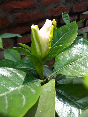Cape jasmine is a smooth, unarmed, perennial, evergreen, woody shrub that grows about 6-8 ft. (1.8-2.4 m) tall with almost equal spread. Roots are quite strong.  Stem is up to 10 cm in diameter and is usually much branched with greyish bark. The plant is found growing in thickets, forests at stream sides, on mountain slopes, on hills, or in valleys and fields. The plant prefers well-drained, fertile, friable soil with high organic matter. The plant is salt intolerant and somewhat drought tolerant. Leaves are opposite, elliptic– ovate, 5–15 cm long and 2-7 cm wide acuminate or obtuse and cuneate at the base, glossy green, smooth and short petioled, 0.2–0.5 cm long. Stipules are large, tubular and obliquely opened on one side.
