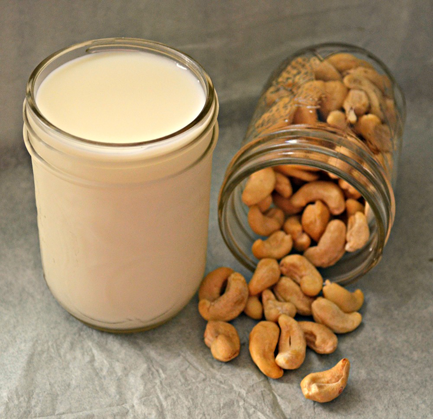 When you make cashew milk at home you may add a small amount of flavorings, such as cinnamon and vanilla extract, but the primary ingredients are just water and cashews. It takes about 1/4 cup of cashews to make 1 cup of cashew milk. Different brands of commercially produced cashew milk contain a variety of ingredients, so check the label on the brand before you buy. Some contain canola oil or salt and most brands have several thickeners, such as guar gum and xanthan gum. Cashew milk is delicious in smoothies, creamy cocktails, desserts, soups, and stews. It can also be added in dessert smoothies: apple pie smoothie, pecan pie smoothie, sweet potato pie smoothie, banana coconut cream pie smoothie, lemon cheesecake smoothie, and tastes-like-ice-cream kale shake.