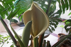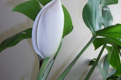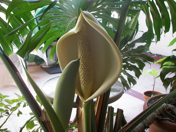 Flower of Monstera deliciosa is composed of a special bract called a spathe enclosing a spadix and the inflorescence is adorned with a cream-white spathe uniform, velvety appearance, covering, like a hood, a yellowish white spike 10 to 15 cm (3.9 to 5.9 in) high and about 3 cm (1.2 in) in diameter. These flowers are bisexual, meaning they contain both androecium and gynoecium. Since they contain both structures, this plant is able to self-pollinate.