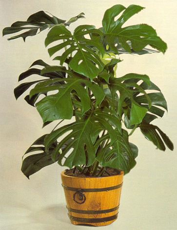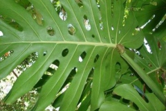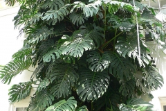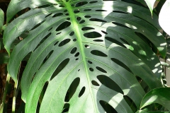 Leaves are large, leathery, glossy, heart-shaped leaves 25–90 cm (10–35.5 in) long and 25–75 cm (10–29.5 in) broad. Young plants have leaves that are smaller and entire with no lobes or holes, but soon produce lobed and fenestrate leaves as they grow. Although it can grow very tall in nature, it only measures between 2 and 3 m (6.6 and 9.8 ft.) when grown indoors. The older the plant, the more the leaves are covered with large perforations which earned the name of “swiss cheese plant” in English.