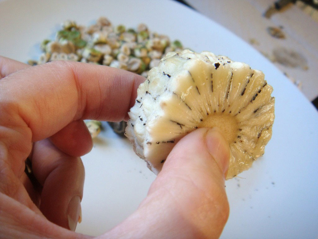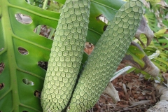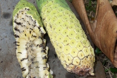 Spadix develops into the compound fruit. The hexagonal scales dry out and separate as the fruit ripens from the base upwards, revealing the white or pale yellow