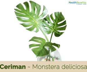 The specific epithet deliciosa means delicious, referring to the edible fruit, while monstera means monstrous, in reference to the size that this plant can grow to over 9 m (30 ft.) in many cases. Few of the popular common names of the plants are Ceriman, Windowleaf, Split-leaf Philodendron, Mexican Breadfruit, Balaco, Balazos, Banana de macaco, Costila de Adan, Cut leafed Philodendron, Fensterblatt, Fruit Salad Plant, Gui bei zhu, Harpon, Mexican breadfruit, Monstera, Monsutera derishioosa, Pinanona monstera, Pinanona, Swiss-cheese plant, Breadfruit-Vine, Delicious Monster, hurricane-plant, Monster Fruit, Locust and Wild Honey, Pine Fruit Tree, fruit salad tree, monsterio delicio, monstereo, balazo, Penglai banana, Cheese Plant and Monstereo.