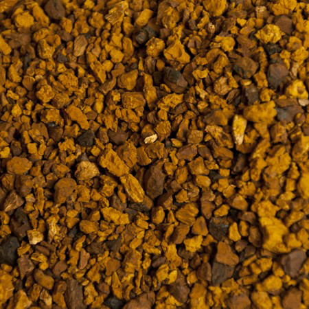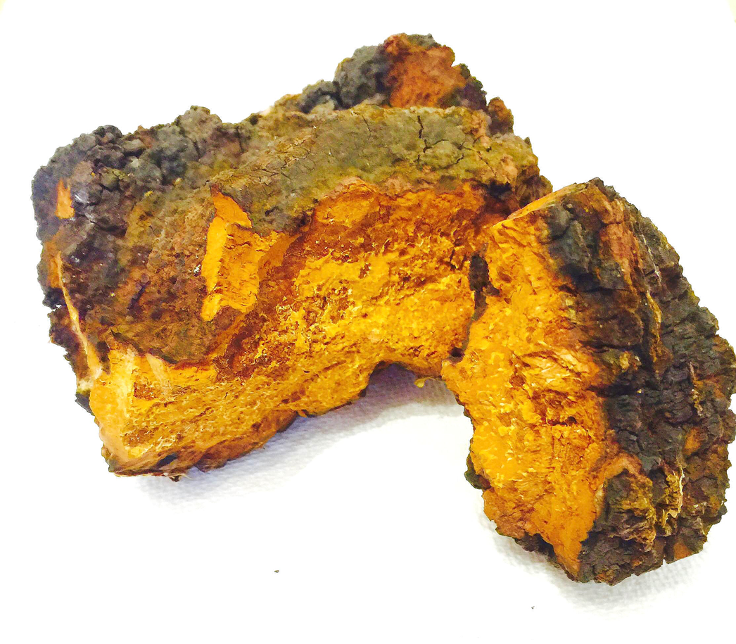 Chaga mushroom is a tough, woody parasitic fungus that commonly grows in cold northern climates, specifically on birch trees. It grows in a “conk” form. Found mostly on white, yellow, and black birch trees they can be found on other hardwoods. Thriving on the cold winter climates of its environment it only grows in the wild, and repeated attempts to cultivate it have all ended in failure. The sterile conk is irregularly formed and has the appearance of burnt charcoal but is distinguished from other growths by its orange tissue. It is not the fruiting body of the fungus, but a mass of mycelium, mostly black due to the presence of massive amounts of melanin.
