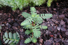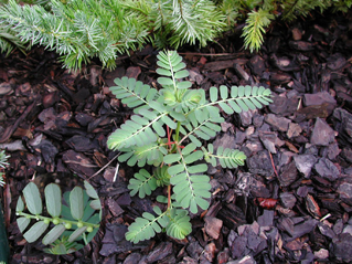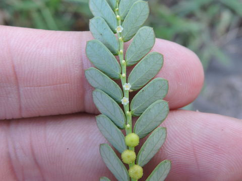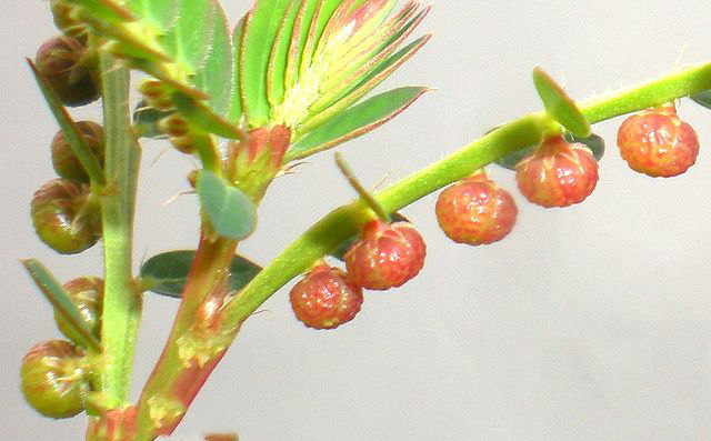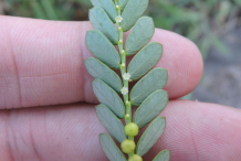 Leaves are arranged alternately along with erect, red stem. They are oblong or oblong-obovate, 7-18 mm long and 7.3 mm wide. It is rounded with a pointed apex and obliquely rounded at the base. The leaves are large at the top and small at petiole. Whenever touched, the leaves shrink automatically just as Mimosa Pudica (Touch-me-not). Leaves are bright to dark green above and gray-green to reddish tinged below.