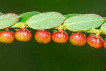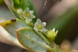 Flowers are quite small and yellowish white. They are 5-merous, axillary and about 1 mm in diameter. Male and female flowers are found on the same plant. Male flowers are ovate or ovate-oblong with greenish sepals, yellowish-white with a green middle strip, erect anther cells, the slits vertical. Female flowers with sessile or very short pedicels 0.15-0.30 mm long, ultimately 0.55-0.68 mm, thickened all over with reddish sepals in the middle, ovary warty. Fruits are found along the underside of the stems.