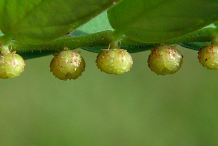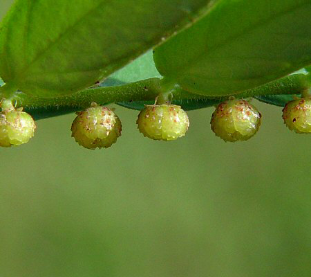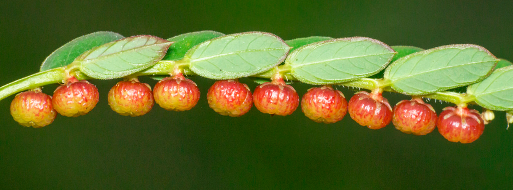 Fruits are green, red or greenish-red globular capsule about 0.12 in. (3 mm) in diameter usually warty, hanging and 6-seeded. The fruits are divided into three parts and their surface has raised scales. Seeds are 1 mm long transversely ribbed on the back, and sides.
