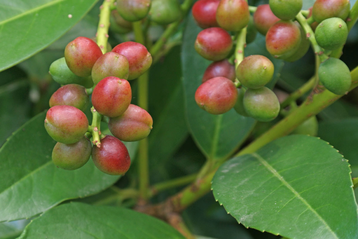 | Leaves | Thick, leathery, shiny, alternate, on short, thick stalks, oblong-ovate, from 3-8 in. (7.6-20.3 cm) long, growing narrower at each end, and with a slightly serrate margin |