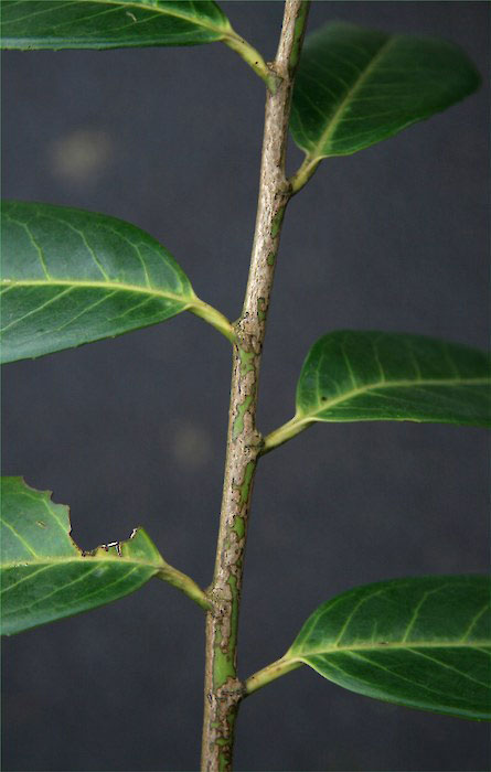 The leaves are thick, leathery, shiny, alternate, on short, thick stalks, oblong-ovate, from 3-8 in. (7.6-20.3 cm) long, growing narrower at each end, and with a slightly serrate margin. The dark green upper surface is smooth and shining and the under one much paler, dull, and the midrib very prominent. There are glandular depressions and hairs near the base. The leaves can have the scent of almonds when crushed. Leaves are evergreen with no fall color.